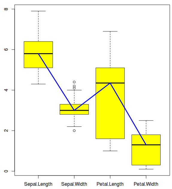 $ lines(1:4,(boxplot((iris)[,c(1:4)], col="yellow"))$stats[3,], col="blue", lwd=3)