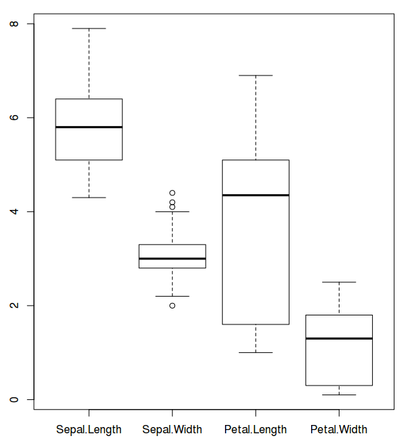$ boxplot((iris)[,c(1:4)]) ## Draws a box plot for lengths and widths of sepals and petals of 3 species