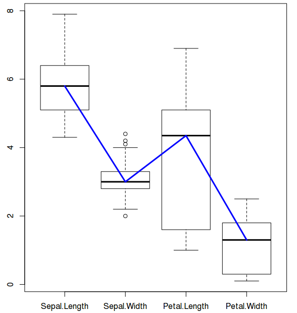 $ lines(1:4,(boxplot((iris)[,c(1:4)]))$stats[3,], col="blue", lwd=3)