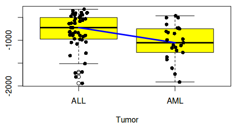 We have added data points over the box plots using strip chart function. add argument allows the user to add stripchart over box plots. vertical argument allows the user to plot points vertically. pch argument is for filled circles.