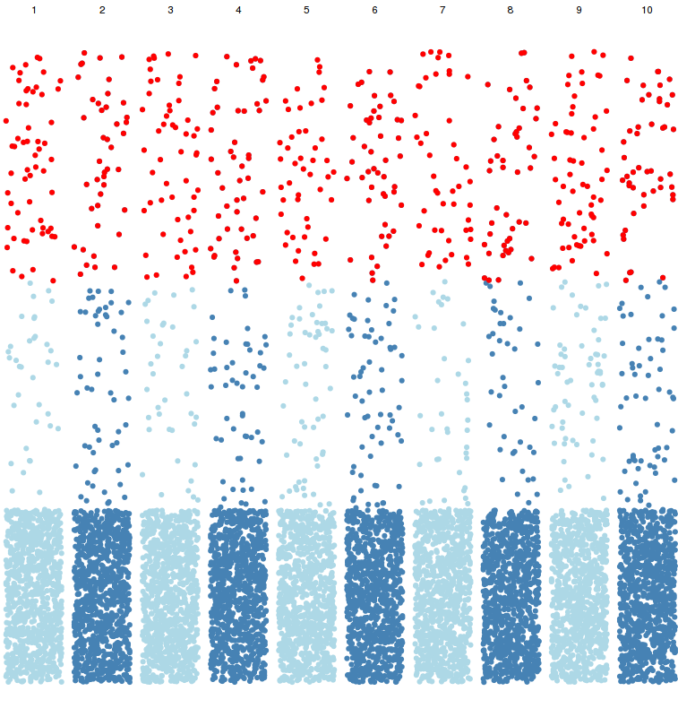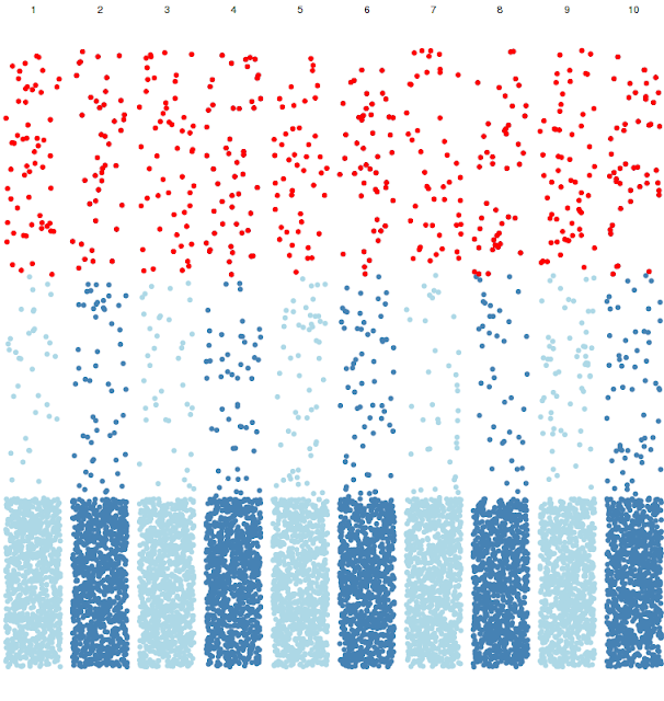 Despite the quality of output, ggplot is a pain in the neck (for beginners) and the error messages are as useful as investor tips on cable. One of the requests i got recently was to plot data into alternate colours for chromosomes. It is very easy to color as per chromosome (factor/Type). In addition, geom_rect is literally pain in the neck to draw. In this note, we will simulate a dataframe for 10 chromosomes, with start and stop for each heterozygocity value. The frame will have 1-10 chromosomes (factor), start and stop coordinates (integers/numbers) and heterozygocity values (floats). Let us get the elephant out first, elephant here is dataframe simulation: