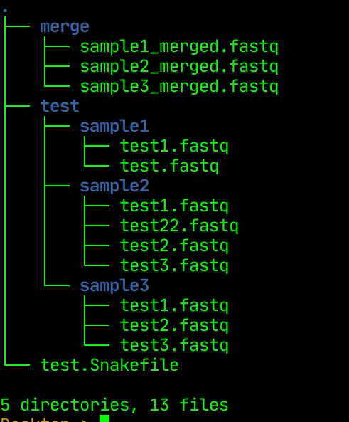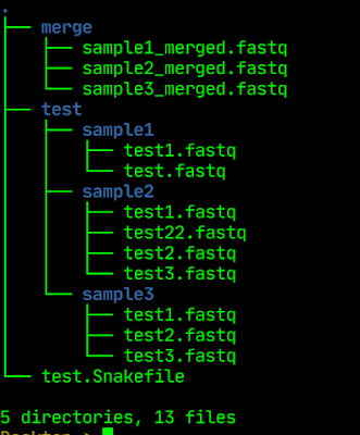 Some times, we need to merge multiple fastq files into one single fastq. However, for some reason, let us say there are multiple directories and within each directory, there are fastq files. These fastq files may or may not be equal in number and also may have different file naming pattern. Let us take a simple example where there are 3 samples and for each sample, there are uneven number of replicates to be merged. For the sake of simplicity, I took only one read file.