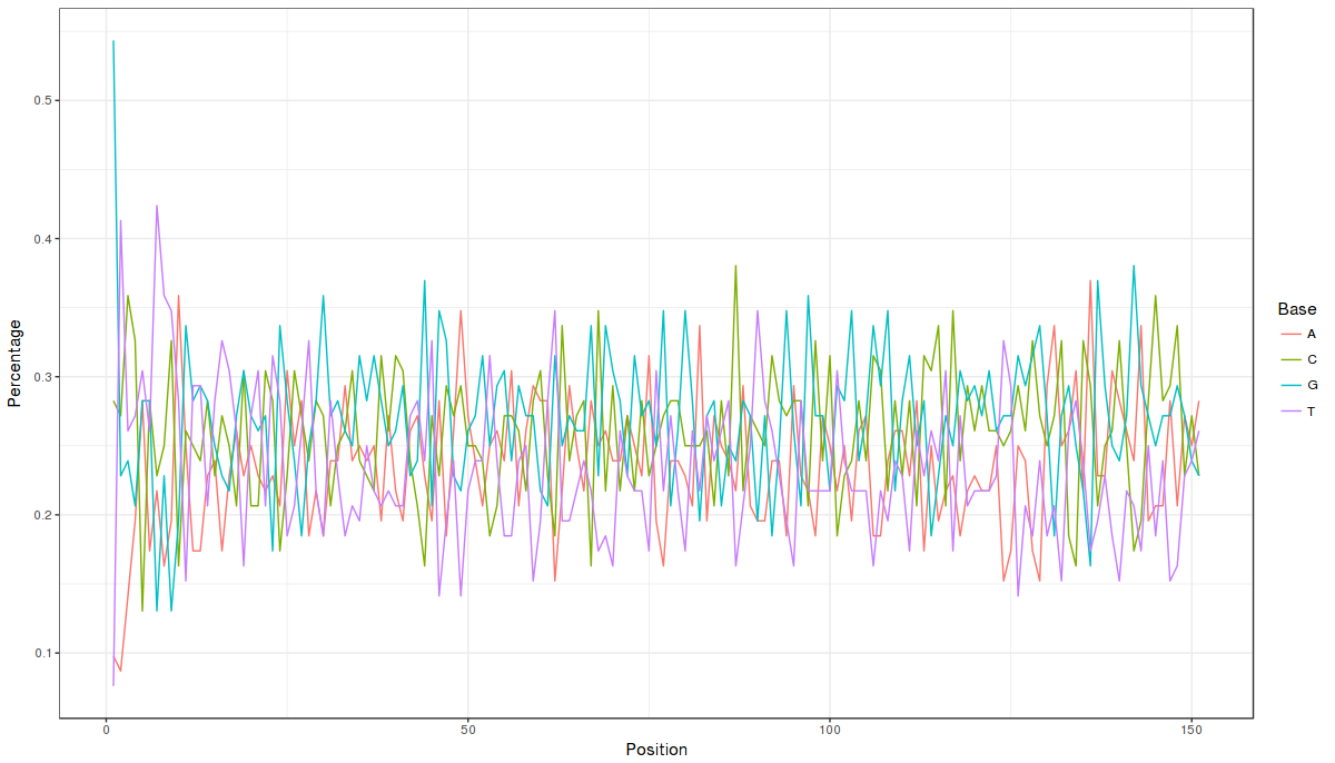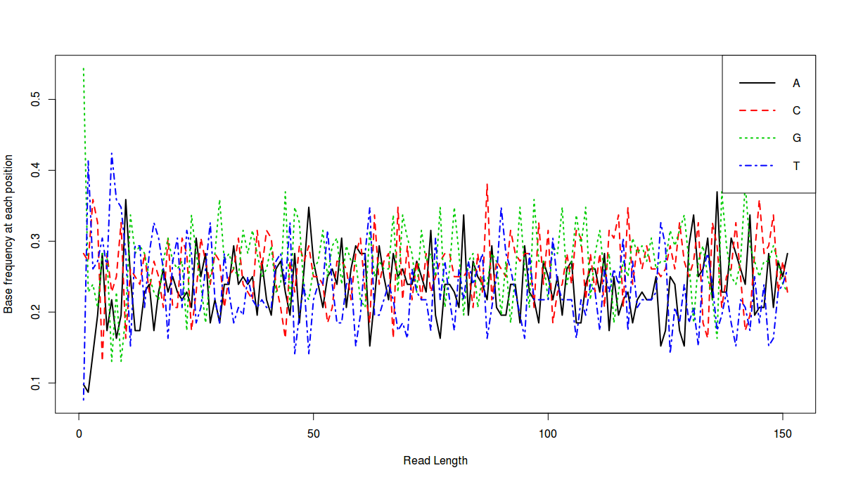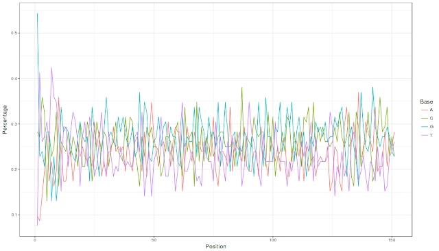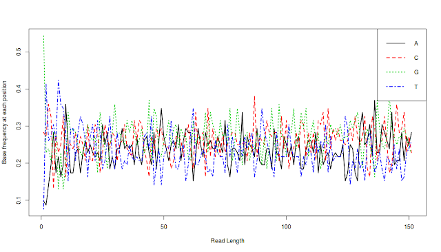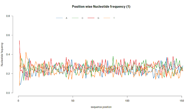 Some times we need to relearn the basics. Base (nucleotide) frequency per sequence (read) and positional frequency for each base are well understood at the time of first generation bioinformatics (with fasta sequences mostly). Now that are we into NGS, we forget (at least I) tend to forget the basics. For such people (like me), here is a note on calculation base frequency per read and also positional frequency for a set of reads. Please note that tools such as FastQC does this. But FastQC does it for first few bases and there are several independent tools to do that.