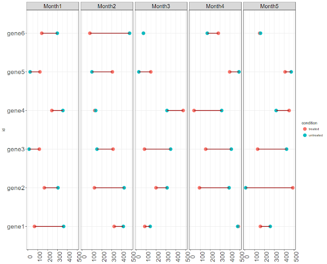 We have 50 observations per time point (5 time points) per condition (two conditions). Hence we have 500 observations (50 values x 2 conditions x 5 times points=500). One thing what users would like to see is expression levels before and after or between any two comparable conditions (for eg normal vs tumor). Let us connect two values by a line, per each gene. So that we know which is what. We can plot the data horizontally or vertically.