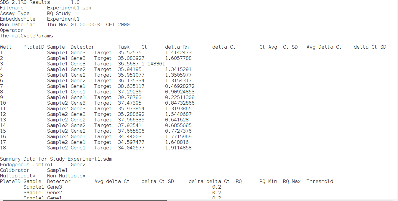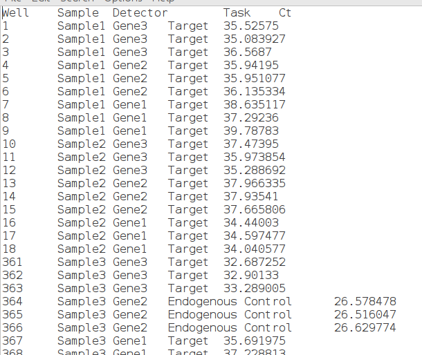 I took the experimental values from these SDS files and stored them in tab separated single file. Values I took are: Well, Sample, Detector, Task, Ct. Well column contains each well number, Sample column contains Sample number, Detector column contains name of the gene, take column contains nature of the transcript (if it is a target or a control) and ct column contain CT values.