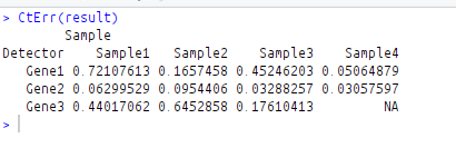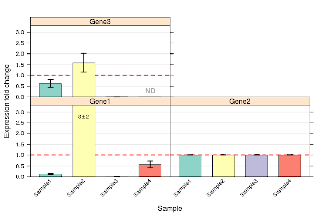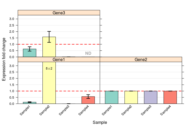 result=ddCtExpression(all.samples2, calibrationSample=c("Sample1", "Sample2"), housekeepingGenes="Gene2", sampleInformation = sampleInformation)