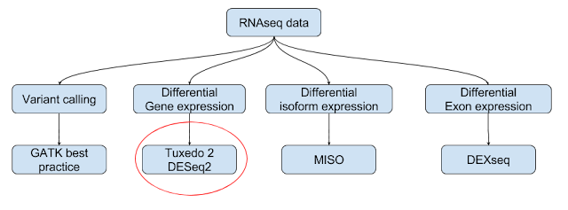 In this note, we will concentrate on Tuxedo protocol 2/ new tuxedo suite in this note. Work flow involves an aligner (HiSat2), an assembler (StringTie) and Analysis library (Ballgown- implemented in R). Tuxedo protocol 1 is covered else where in this blog.