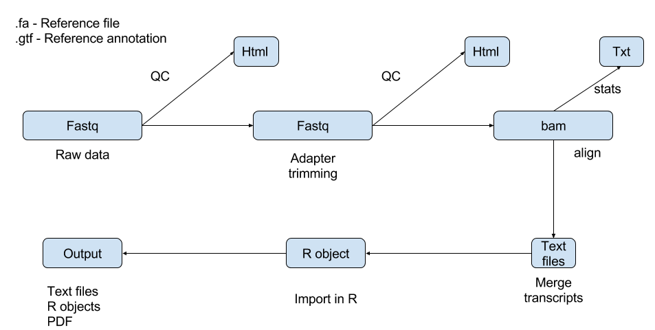 Reference files needed for RNAseq data analysis are reference fasta and reference annotation i.e transcript information (chromosomal coordinates of gene, transcript, exon in an organism). Reference sequence file is in fasta format (.fa) and annotation information is in .gtf format.