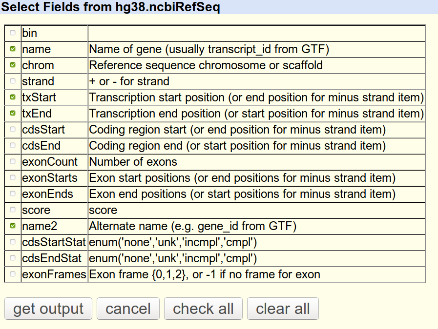 Choose the group (genes and Gene predictions), track (NCBI RefSeq), region (of interest) and output format.