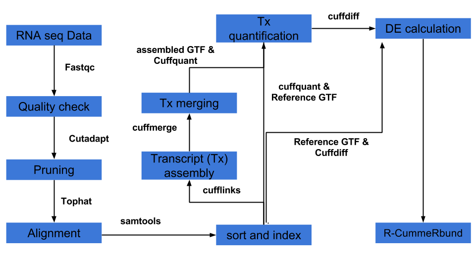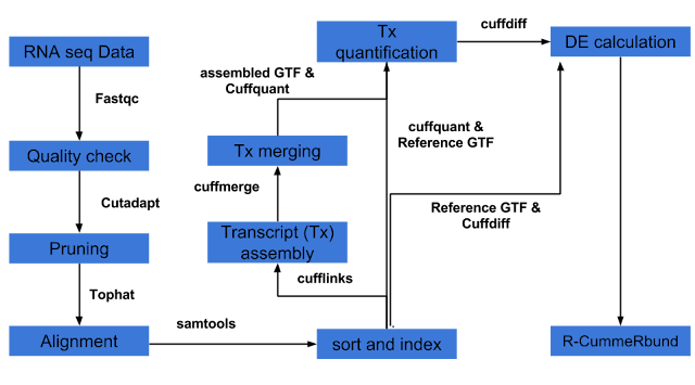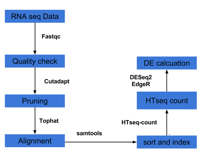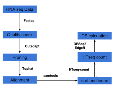In following notes, I would outline variant calling, differential gene expression using multiple methods (pipelines) linked to dedicated pipeline blogs. Following are the pipelines that would be explained:
