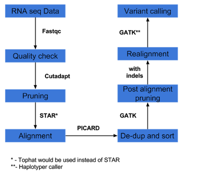 2) Variant calling as per GATK best practices workflow, as outlined here. Instead of suggested RNASTAR aligner, example uses Tophat aligner. In brief, GATK best practice is as outlined below and the bash script for executing entire pipe line is given here.